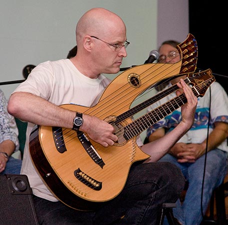 Playing the double-neck harp guitar I built at the Harp Guitar Gathering